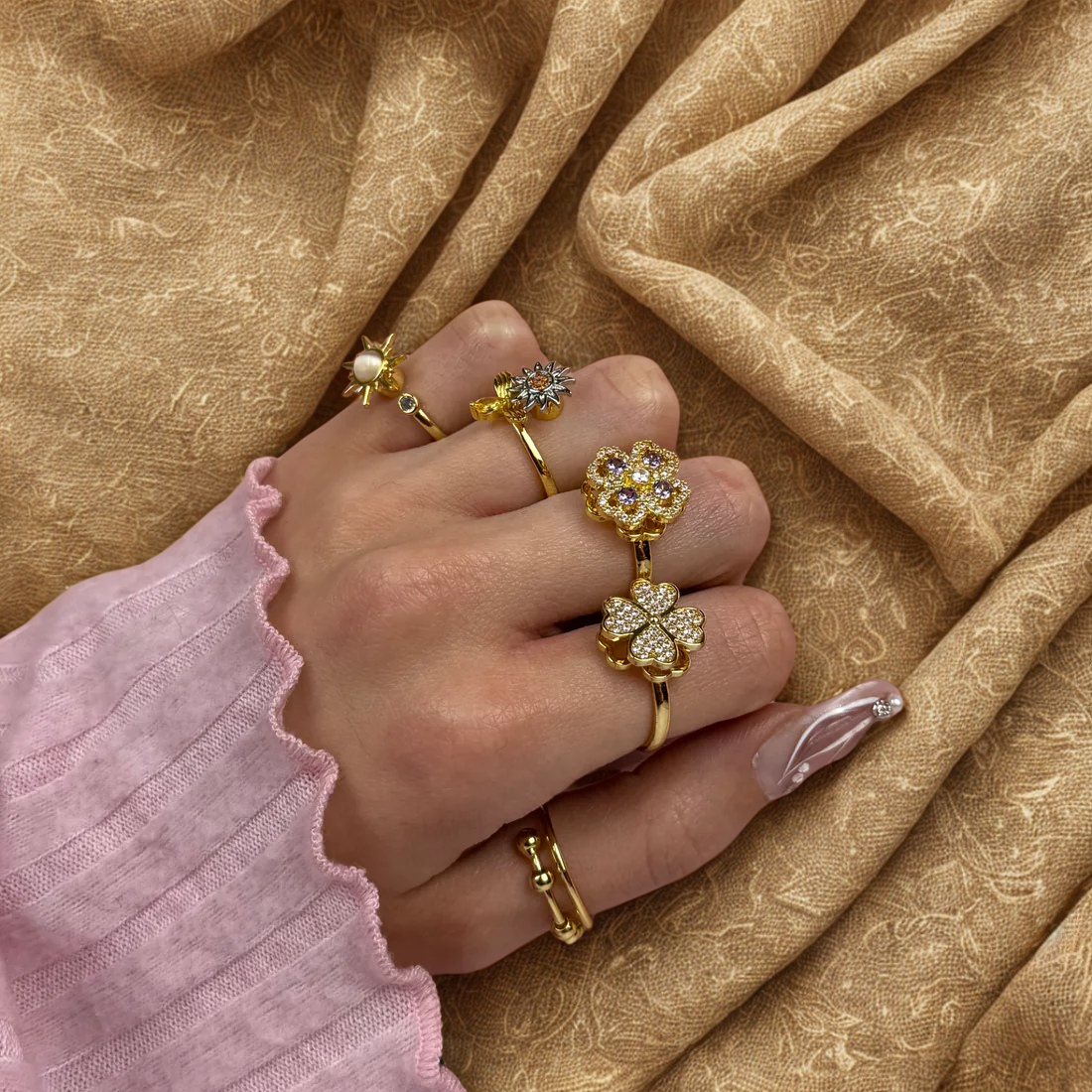 Elegant rings with a rotating element. Helps relieve stress while keeping you effortlessly stylish.